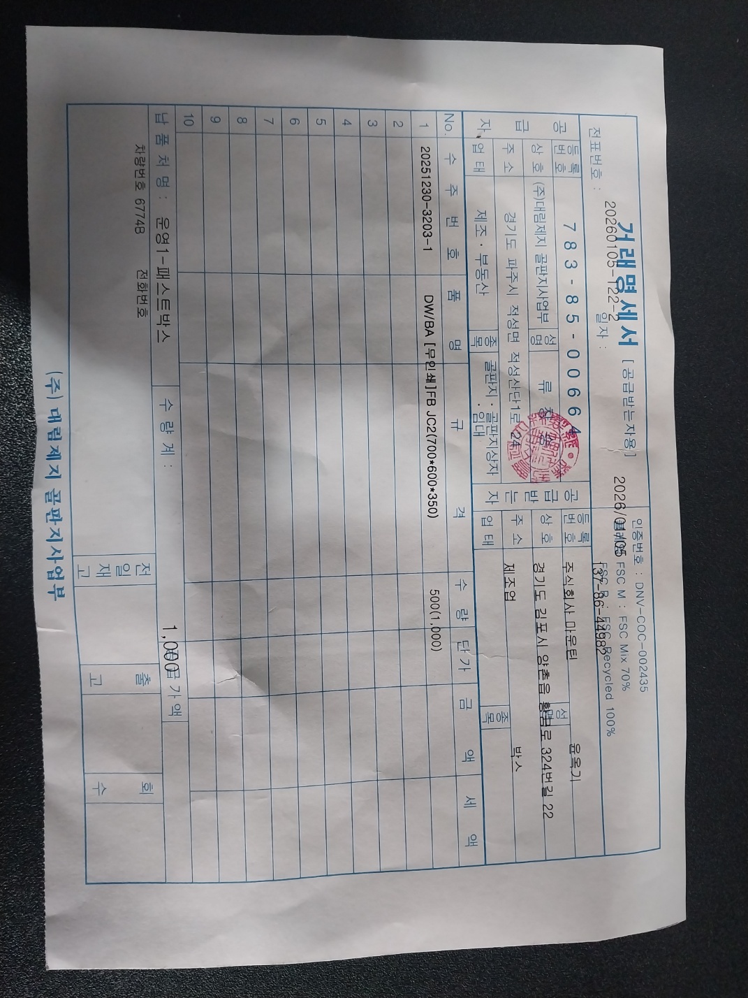 #1. FB JC2 / 수량 : 1,000 / 규격 : 700*600*350(SK3SK/AB)